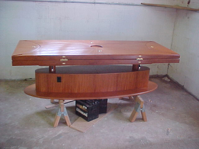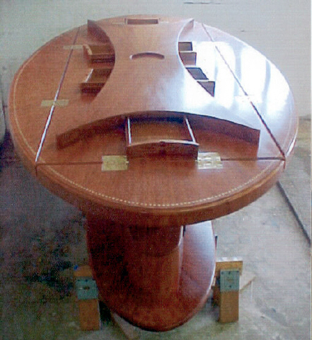 This is the largest of three tables built for the Schooner MARY NORMA. To the right of the photo, you can see the smallest of the three. They were made from ash and purple heart.